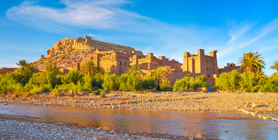 Café da manhã. Saída para as montanhas do alto Atlas pelo Col de Tichka, a estrada muda de paisagem do verde forte dos vales, ao ocre vermelho do Col de Tizi até chegarmos a Ouarzazate, tempo livre para almoço e continuação até Kelaa de los Mguna, uma famosa cidadezinha onde se cultiva uma espécie de rosa de excelente aroma, para explorar a rota dos kasbahs. Com este nome, no sul do Alto Atlas, é conhecido um passeio por uma série de fortalezas. Construídas em adobe com torres com ameias e decorações em tijolo bruto, são por vezes autênticas cidades fortificadas. Estão inseridos numa paisagem espetacular onde o deserto e as montanhas se encontram, combinando todos os tons de ocre e vermelho. Se os antigos kasbahs seduzem pelo seu poder de evocação, a paisagem comove-se pela força dos seus contrastes, pela sua luminosidade e silêncio. Este percurso é um dos mais atrativos e solicitados de Marrocos. Acomodação. Jantar.
